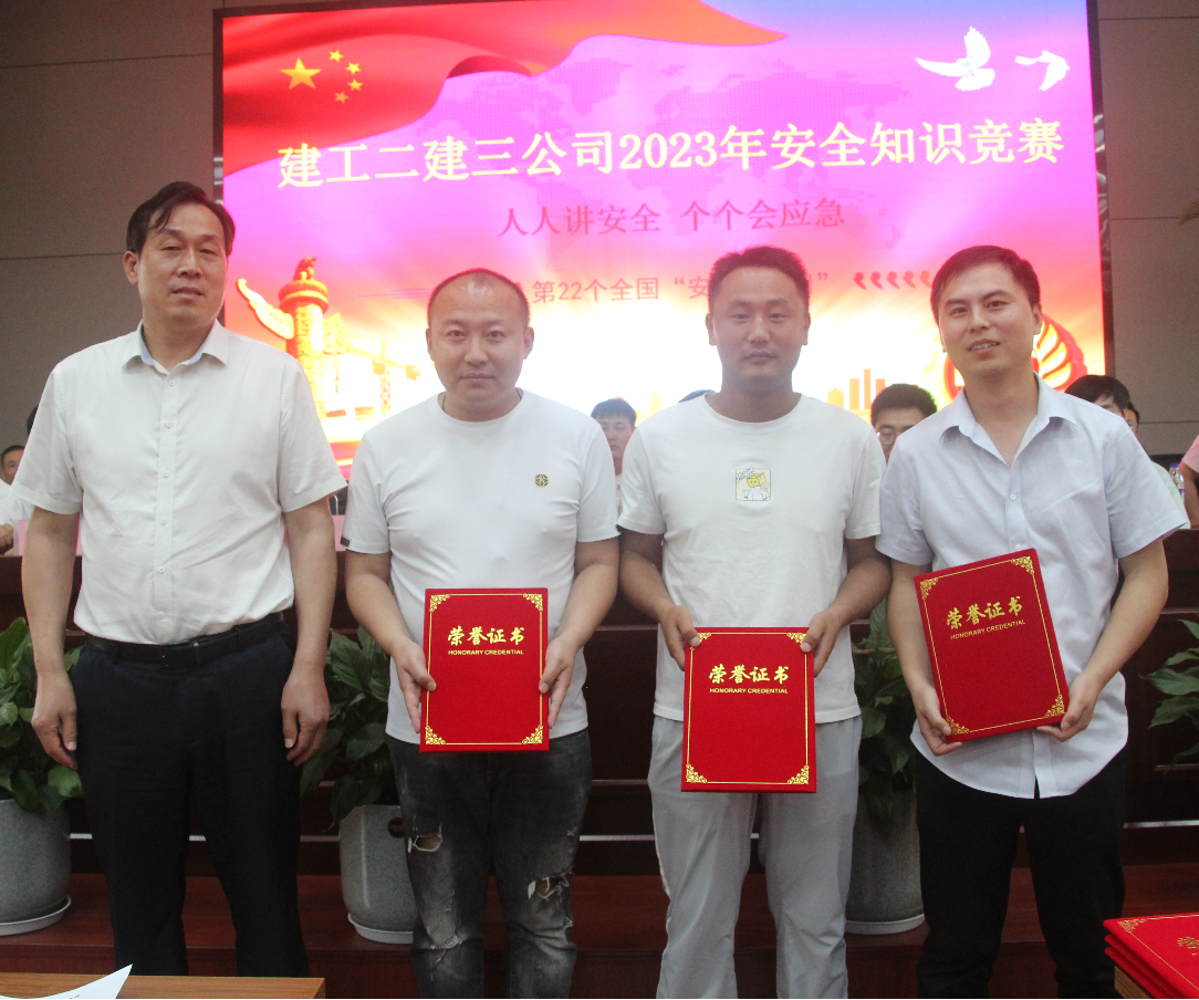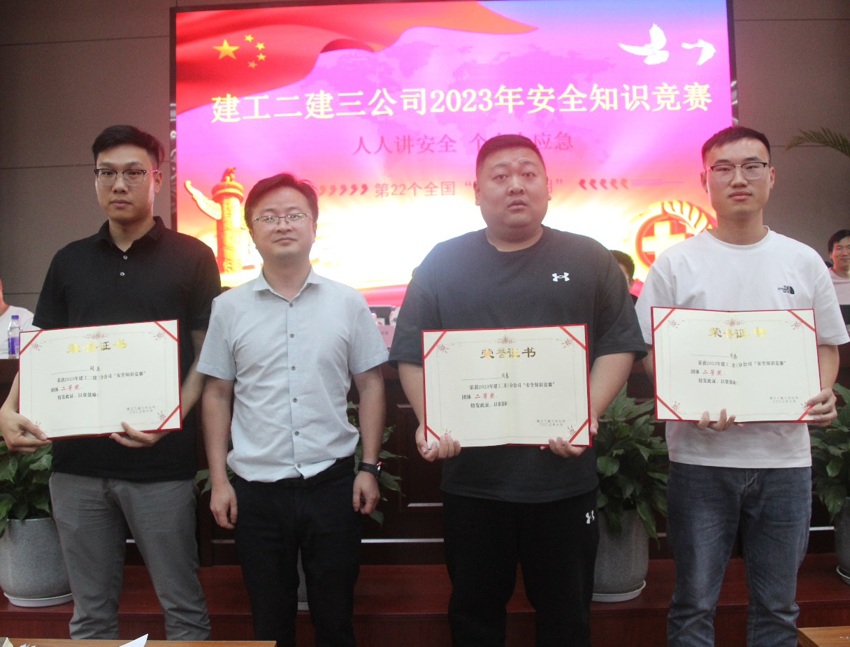 整個(gè)競(jìng)賽過程氣氛熱烈,賽序井然。選手沉著冷靜、機(jī)智應(yīng)戰(zhàn),既展示了選手們豐富的安全知識(shí)儲(chǔ)備,更體現(xiàn)了公司員工的從業(yè)素養(yǎng)和團(tuán)隊(duì)精神。搶答環(huán)節(jié)把活動(dòng)推向了高潮,賽場(chǎng)氣氛活躍而緊張,選手們?nèi)σ愿?、奮力搶奪,隊(duì)伍比分拉開差距。最終,由宿遷中南紫云集項(xiàng)目代表隊(duì)拔得頭籌,銅陵吾悅?cè)A府項(xiàng)目代表隊(duì)獲得第二名,分公司機(jī)關(guān)代表隊(duì)獲得第三名。