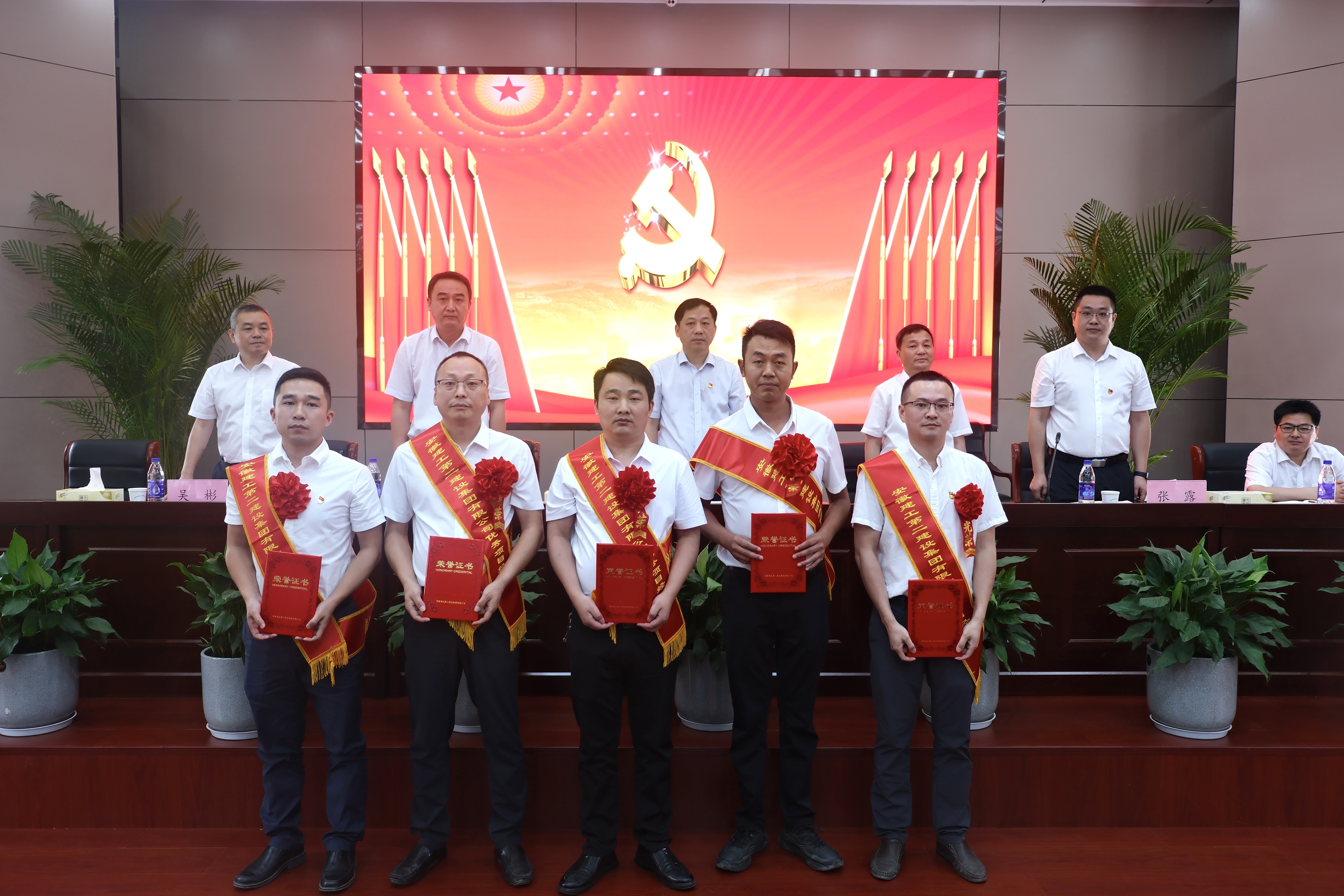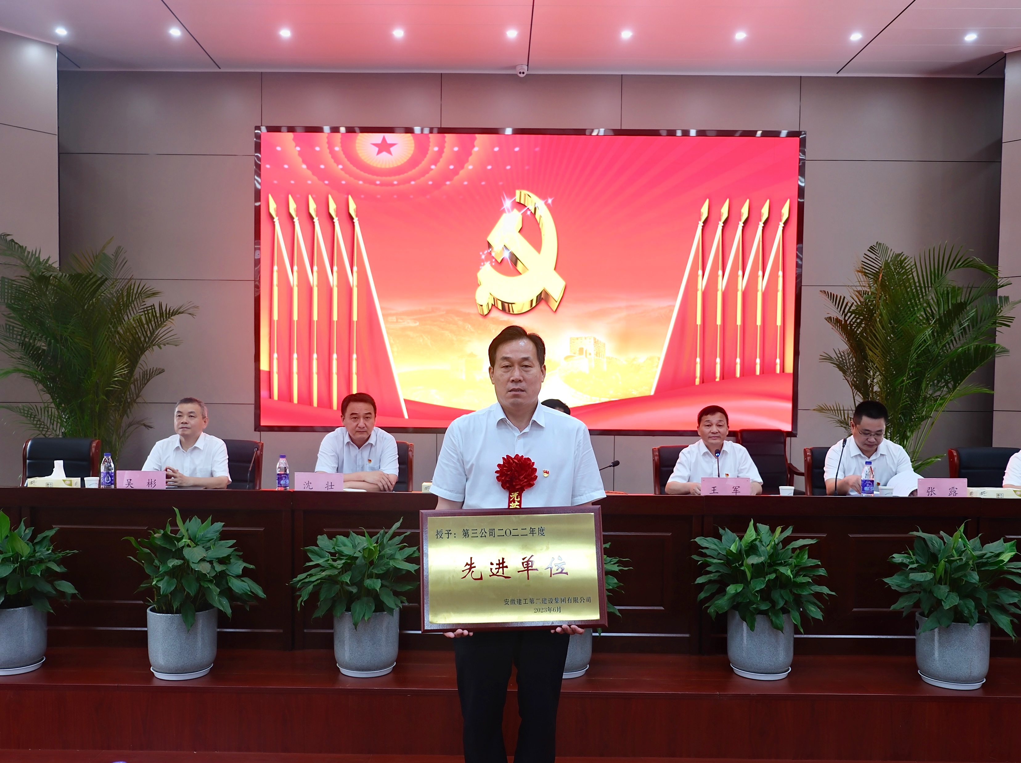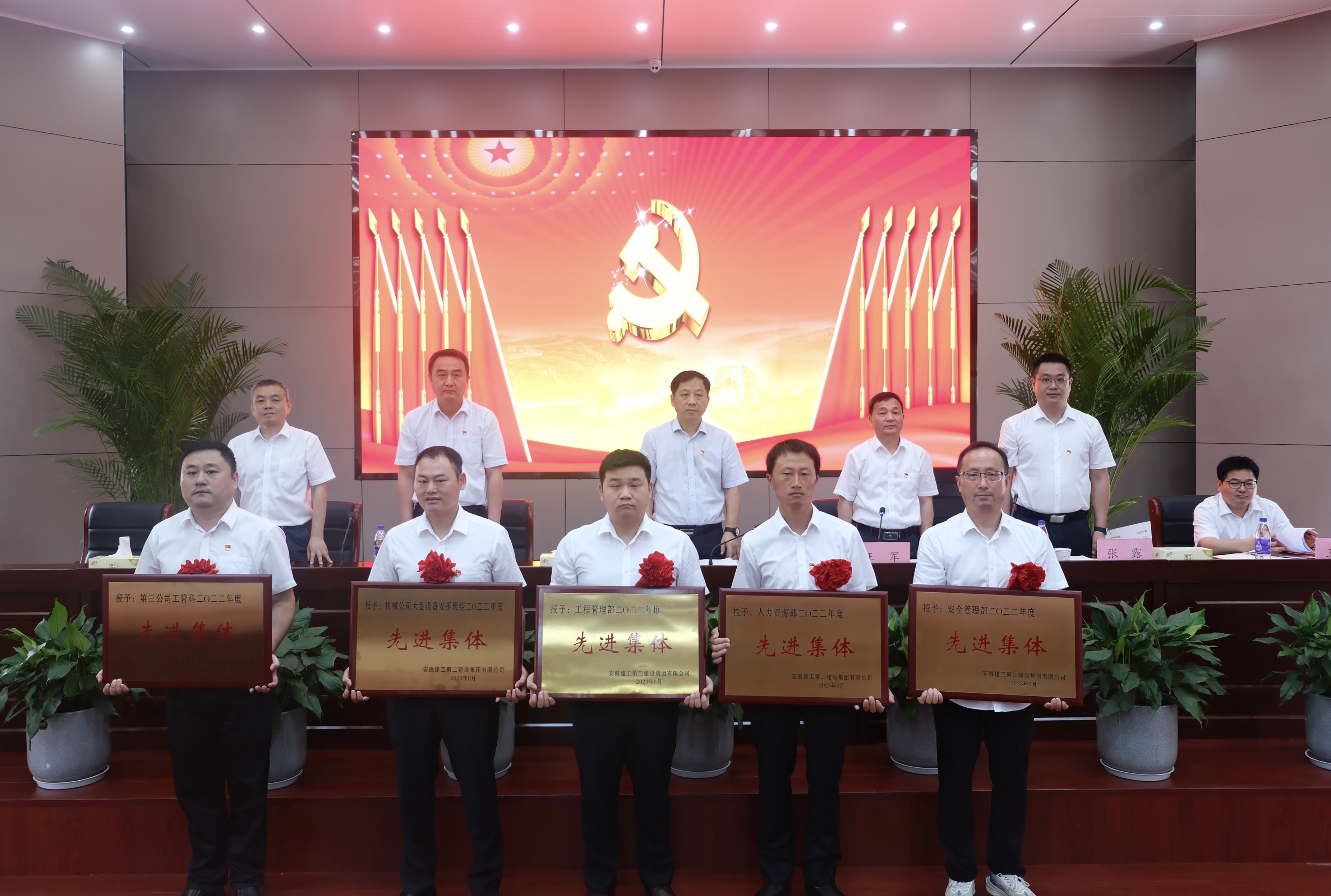 為慶祝中國共產(chǎn)黨成立102周年,深入開展學(xué)習(xí)貫徹習(xí)近平新時(shí)代中國特色社會主義思想主題教育,落實(shí)黨的二十大精神,6月29日上午,建工二建集團(tuán)在新會議室召開慶祝建黨102周年表彰暨黨課報(bào)告會。公司在肥領(lǐng)導(dǎo)、機(jī)關(guān)部門負(fù)責(zé)人及黨員、所屬單位領(lǐng)導(dǎo)班子成員、群團(tuán)工作人員、公司黨委2022年度“兩優(yōu)一先”受表彰集體及受表彰人員代表、公司2022年度“先進(jìn)集體”“先進(jìn)個(gè)人”受表彰集體及受表彰人員代表,公司團(tuán)委2022年度“兩優(yōu)一紅”受表彰集體及受表彰人員代表,部分預(yù)備黨員參會。黨委副書記、總經(jīng)理葛輝出席會議并作黨課報(bào)告。會議由黨委副書記、工會主席王軍主持。