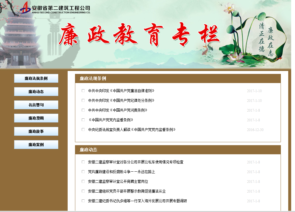 該專欄以公司網(wǎng)站為依托,設(shè)有廉政法規(guī)條例、廉政動態(tài)、名言警句、廉政漫畫、廉政故事、廉政案例六大板塊。通過廉政法規(guī)條例,轉(zhuǎn)載《中國共產(chǎn)黨廉潔自律準(zhǔn)則》、《中國共產(chǎn)黨紀(jì)律處分條例》、《中國共產(chǎn)黨問責(zé)條例》、《安徽省預(yù)防職務(wù)犯罪條例》等一系列黨紀(jì)黨規(guī)、國家法律法規(guī)知識,并在每一次修訂后及時(shí)更新,為廣大黨員干部學(xué)習(xí)使用提供方便。運(yùn)用廉政動態(tài),及時(shí)發(fā)布集團(tuán)紀(jì)委和公司黨委、紀(jì)委通知要求,通報(bào)監(jiān)察審計(jì)事項(xiàng)與結(jié)果,做到監(jiān)督的公開化、透明化。以名言警句、廉政漫畫、廉政故事、廉政案例感染人、陶冶人,內(nèi)容直觀形象,用勤廉典型激勵人,深入剖析典型違紀(jì)案例,加強(qiáng)警示教育。