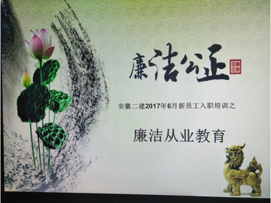 6月19日,安徽二建紀委對新入職員工進行了崗前廉潔從業(yè)教育培訓(xùn),首次將廉潔自律作為走上新崗位的第一課,引導(dǎo)和加強新員工在思想上牢固樹立“廉潔從業(yè),遵紀守法”的廉潔意識,提高廉潔自律的辨識能力和自我約束力。