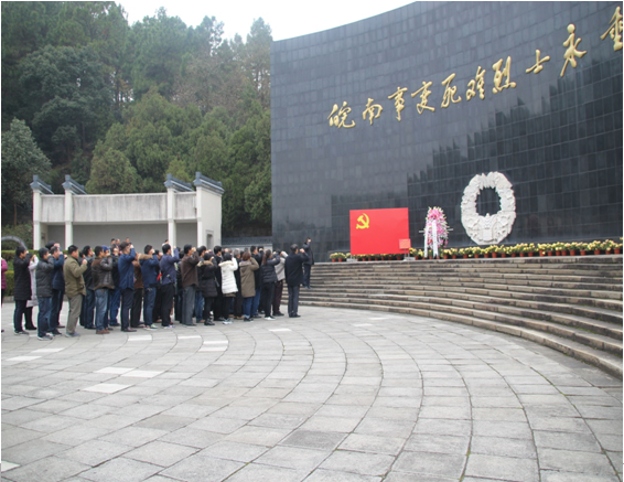 初冬的皖南山區(qū)并無太多蕭瑟之感,目之所及,綿延起伏的群山上仍是郁郁蔥蔥,新四軍軍部舊址就位于這綠水青山之間。黨員同志們懷著敬仰的心情先后參觀了新四軍軍部舊址、新四軍軍部大會堂舊址、皖南事變烈士陵園,并敬獻花籃與挽聯(lián)。通過講解員的解說,大家了解了新四軍的建立發(fā)展壯大過程、軍部主要機關設置、新四軍將領及女兵的英勇抗日的事跡,以及震驚中外的“皖南事變”的經(jīng)過。豐富而詳實的館藏史料,讓黨員們重溫了中國共產(chǎn)黨領導中國人民取得革命成功的艱辛歷程;同時也深刻認識到只有在中國共產(chǎn)黨領導下,中國的革命事業(yè)才會取得不斷勝利。
