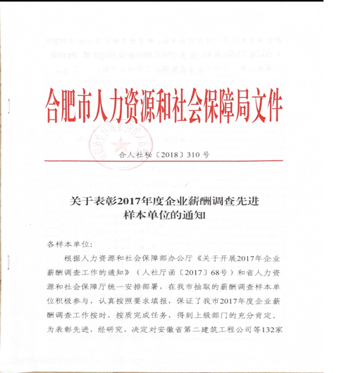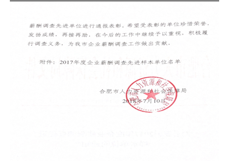 根據(jù)人力資源和社會(huì)保障部辦公廳《關(guān)于開展2017年度企業(yè)薪酬調(diào)查先進(jìn)樣本單位的通知》(人社廳函【2017】68號(hào)),我公司領(lǐng)導(dǎo)高度重視,按照通知要求精心組織安排人員,以快速高效嚴(yán)謹(jǐn)?shù)墓ぷ鲬B(tài)度,圓滿完成了此次企業(yè)薪酬調(diào)查工作,得到了上級(jí)部門的充分肯定,榮獲了“2017年度企業(yè)薪酬調(diào)查先進(jìn)樣本單位”殊榮。
