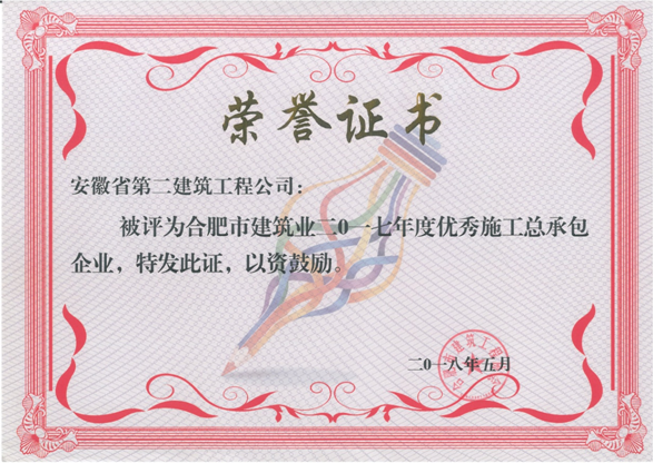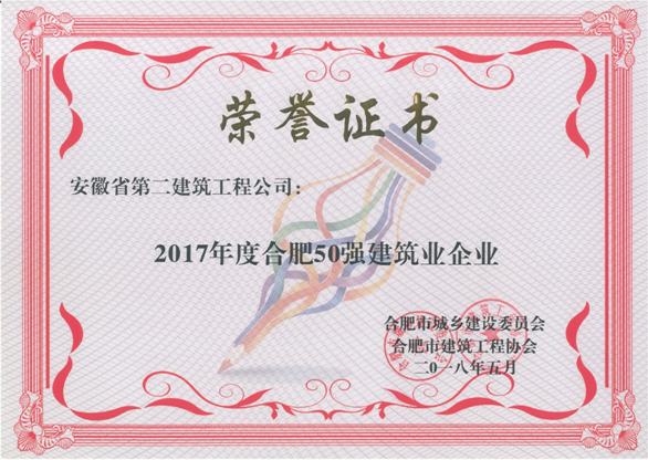 日前,公司被合肥市城鄉(xiāng)建設(shè)委員會、合肥市建筑工程協(xié)會授予“2017年度合肥市50強建筑業(yè)企業(yè)”、“優(yōu)秀施工總承包企業(yè)”、“質(zhì)量管理先進企業(yè)”、“外向輸出先進企業(yè)”、“統(tǒng)計管理先進企業(yè)”。徐柏林、邵善松、郭行義三名同志獲“合肥市優(yōu)秀項目經(jīng)理”稱號,梅紅同志獲“質(zhì)量管理先進個人”稱號,周俊同志獲“起重設(shè)備安裝管理先進個人”稱號。