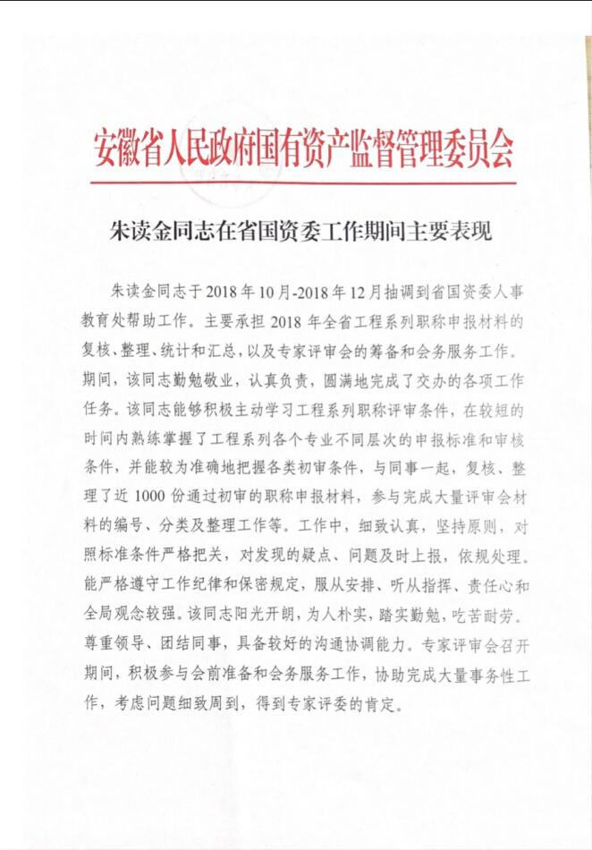2018年10月-2018年12月被抽調(diào)到省國資委人事教育處幫忙工作,周末加班加點,兢兢業(yè)業(yè),與國資委同事一同審查近1000份職稱申報材料,工作得到專家評委一致肯定。