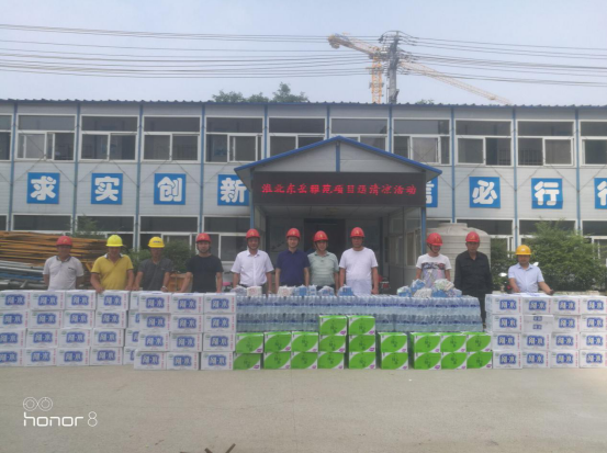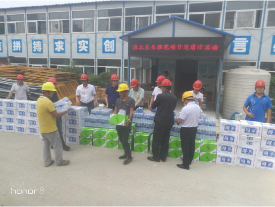 為做好公司夏季安全生產(chǎn)和防暑降溫工作,關(guān)心關(guān)愛一線職工, 6 月22 日,公司副總經(jīng)理葉和永,總經(jīng)理助理蒯家江、安全總監(jiān)曹建在分公司支部書記陳習(xí)武的陪同下來到淮北東岳雅苑項目部,為一線工人送去飲料、藥品等防暑降溫物資,并囑咐基層管理人員采取有效防暑降溫和安全生產(chǎn)保障措施, 避免高溫時段疲勞作 業(yè), 防止中暑和其他各類生產(chǎn)安全事故的發(fā)生。