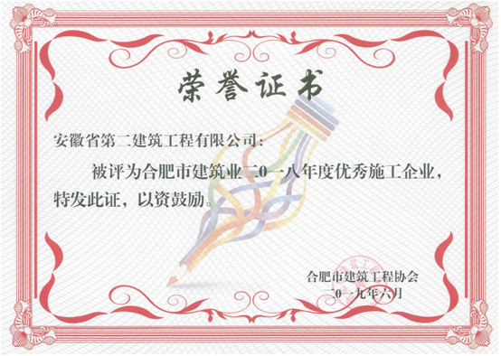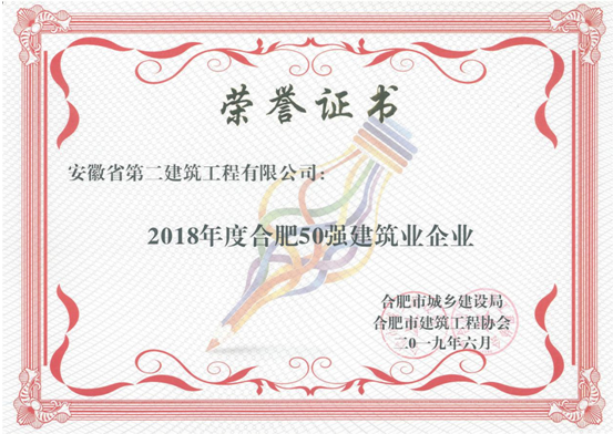 日前,公司被合肥市城鄉(xiāng)建設(shè)委員會(huì)、合肥市建筑工程協(xié)會(huì)授予“2018年度合肥市50強(qiáng)建筑業(yè)企業(yè)”、“優(yōu)秀施工總承包企業(yè)”、“質(zhì)量管理先進(jìn)企業(yè)”、“安全管理先進(jìn)企業(yè)”、“外向輸出先進(jìn)企業(yè)”、“統(tǒng)計(jì)管理先進(jìn)企業(yè)”、“起重設(shè)備安全管理先進(jìn)企業(yè)”。張尚禮同志獲“安徽省優(yōu)秀項(xiàng)目經(jīng)理”稱號(hào),崔俊、鄭慧君、任兵三名同志獲“合肥市優(yōu)秀項(xiàng)目經(jīng)理”稱號(hào);蒯家江同志獲“合肥市外向輸出先進(jìn)個(gè)人”稱號(hào);曹建同志獲“合肥市安全管理先進(jìn)個(gè)人”稱號(hào);王貴宏同志獲“合肥市質(zhì)量管理先進(jìn)個(gè)人”稱號(hào);周俊同志獲“合肥市起重設(shè)備安全管理先進(jìn)個(gè)人”稱號(hào)。