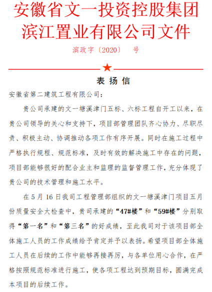 安徽二建文一·塘溪津門五標(biāo)項(xiàng)目管理團(tuán)隊(duì)堅(jiān)持疫情防控與復(fù)工復(fù)產(chǎn)兩手抓、兩手硬,管理團(tuán)隊(duì)齊心協(xié)力、盡職盡責(zé)、積極主動(dòng),保質(zhì)保量完成施工任務(wù)。在5月16日安徽省文一投資控股集團(tuán)濱江置業(yè)有限公司工程管理部組織的五月份質(zhì)量安全大檢查中,“47#樓”取得第一名的好成績(jī),獲建設(shè)單位通報(bào)表?yè)P(yáng)。