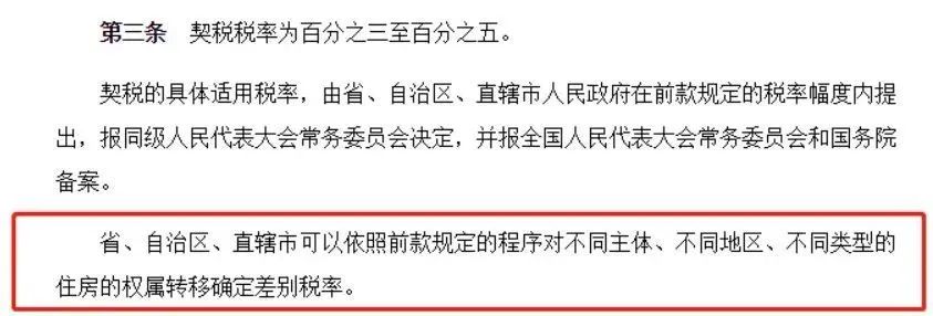 其實,1997年發(fā)布的《中華人民共和國契稅暫行條例》中,早已規(guī)定契稅稅率為百分之三至百分之五。但各省市可以根據(jù)實際情況確定差別稅率。