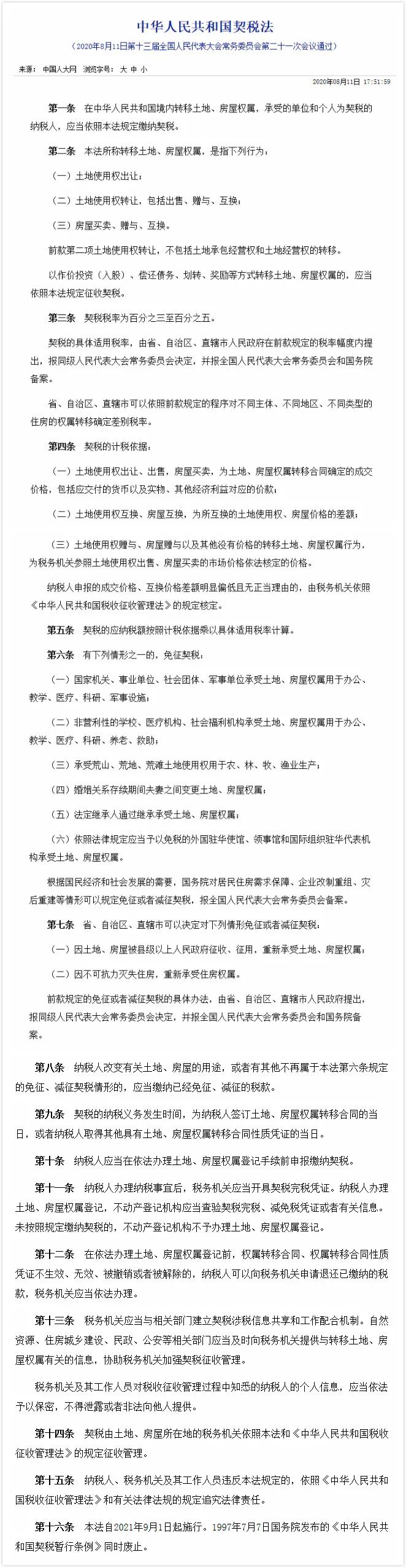 與房屋買賣相關的《中華人民共和國契稅法》(以下簡稱《契稅法》)在8月11日的第十三屆全國人民代表大會常務委員會第二十一次會議通過,并將于2021年9月1日起施行。