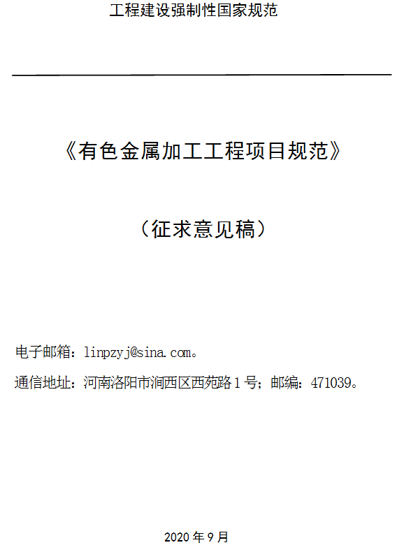 《有色金屬加工工程項目規(guī)范(征求意見稿)》