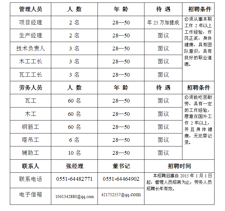 因安徽省第二建筑工程公司承建的阿爾及利亞阿爾及爾654套住房項目及太把薩大學城工程項目的需要,現(xiàn)公開面向社會招聘項目管理人員及勞務工人,具體招聘事項見附表。