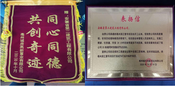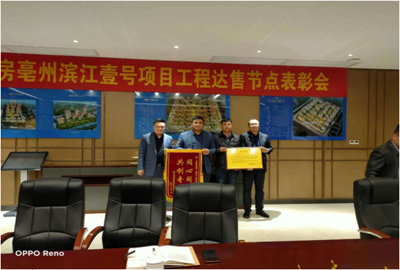 北京城房亳州公司真摯邀請四分公司及項(xiàng)目機(jī)關(guān)人員參加濱江壹號項(xiàng)目預(yù)售表彰會,北京城房對二建公司的努力與付出表示肯定與認(rèn)可,并頒發(fā)錦旗與表揚(yáng)信。