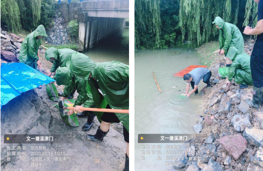 一分公司文一·塘溪津門項(xiàng)目全體人員積極響應(yīng)公司及建設(shè)單位的號(hào)召,立即展開了一系列的抗洪搶險(xiǎn)工作。針對(duì)D-09-04地塊金斗公園內(nèi)部河道漫水至工地影響現(xiàn)場(chǎng)安全的情況,及時(shí)在河道漫水區(qū)域堆放沙袋,封堵漫水口,保河堤戰(zhàn)洪水,抗洪搶險(xiǎn)奮戰(zhàn)一線。