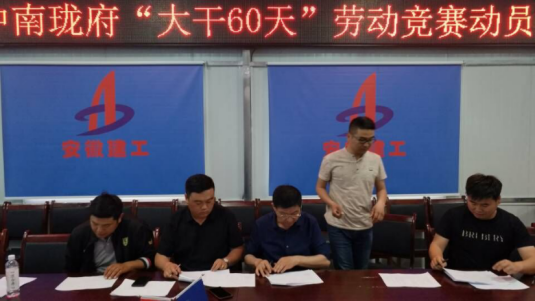 為確保“大干60天”勞動競賽順利進行,三公司懷遠中南·瓏府項目積極響應公司要求,提前籌劃,科學組織,合理安排,制定了切實可行的勞動競賽方案,做好人員分工,物資設備提前計劃等工作。召開動員大會,提出“大干60天,產值五千萬”的口號,并與各班組簽訂目標責任書,明確獎罰,鼓勵班組奮勇爭先,營造大干氛圍。