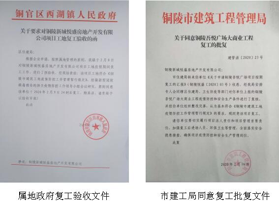2月12日,銅陵市住建局安排專人會同銅官區(qū)住建、衛(wèi)生防疫等部門,對項(xiàng)目部疫情防控及安全生產(chǎn)條件進(jìn)行復(fù)核,認(rèn)為基本符合《銅陵市建筑工地疫情防控工作管理暫行規(guī)定》的要求。2月17日,銅陵市住建局下發(fā)《關(guān)于同意銅陵吾悅廣場大商業(yè)工程復(fù)工的批復(fù)》,同時(shí)提出要加強(qiáng)復(fù)工后進(jìn)場人員環(huán)保衛(wèi)生管理,全面落實(shí)安全隱患排查,確保項(xiàng)目疫情防控和安全生產(chǎn)管理到位。