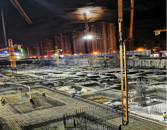 施工進(jìn)入白熱化階段,遇到材料短缺、勞務(wù)班組緊張等困難,分公司領(lǐng)導(dǎo)更高度重視,組建了由各個(gè)科室負(fù)責(zé)人參加的“重點(diǎn)項(xiàng)目工作協(xié)調(diào)QQ群”,把項(xiàng)目遇到的難題及時(shí)反饋并予以解決,分公司經(jīng)理馬福才、支部書(shū)記陳習(xí)武更是經(jīng)常駐扎現(xiàn)場(chǎng),解決勞務(wù)外援、協(xié)調(diào)處理大宗主材進(jìn)場(chǎng)等問(wèn)題。在每日召開(kāi)的生產(chǎn)調(diào)度會(huì)上,項(xiàng)目經(jīng)理汪傳松多次強(qiáng)調(diào),要超前謀劃,科學(xué)組織,大膽管理,各勞務(wù)班組根據(jù)現(xiàn)有工作面盡快增加班組和一線作業(yè)工人,上足人員;項(xiàng)目部要合理配置人力、物力、塔吊等垂直運(yùn)輸設(shè)備,安排好工序銜接,實(shí)現(xiàn)晝夜不間斷施工,同時(shí)要確保“大干大安全、小干有安全”,針對(duì)業(yè)主6月20日提出正負(fù)零節(jié)點(diǎn)計(jì)劃,項(xiàng)目部制定了四點(diǎn)措施:一是分解目標(biāo),細(xì)化責(zé)任,日排計(jì)劃,要求現(xiàn)場(chǎng)施工人員根據(jù)圖紙認(rèn)真梳理計(jì)算各標(biāo)段工程量,詳細(xì)分解施工任務(wù);二是明確現(xiàn)場(chǎng)責(zé)任分工,加大管理力度,督促現(xiàn)場(chǎng)盯控力度,保障工程質(zhì)量;三是加大協(xié)調(diào)力度,優(yōu)化資源,整合機(jī)械設(shè)備發(fā)揮最大的生產(chǎn)力;四是加強(qiáng)與勞務(wù)班組負(fù)責(zé)人的溝通,明確節(jié)點(diǎn)任務(wù),輸貫信念,激發(fā)工人潛力,提高工作效率。全體人員要同心協(xié)力,充分發(fā)揮團(tuán)結(jié)奮進(jìn)精神,要見(jiàn)縫插針,穿插作業(yè),要有“搶晴天戰(zhàn)雨天,白天晚上加班干”的精神,強(qiáng)勢(shì)推進(jìn)施工進(jìn)度。從5月12日到5月25日已完成產(chǎn)值2300萬(wàn),創(chuàng)安徽二建公司月產(chǎn)值歷史新高;截至目前,鋼筋用量1700噸;混凝土用量11000方,平均每日混凝土澆筑量550方。
