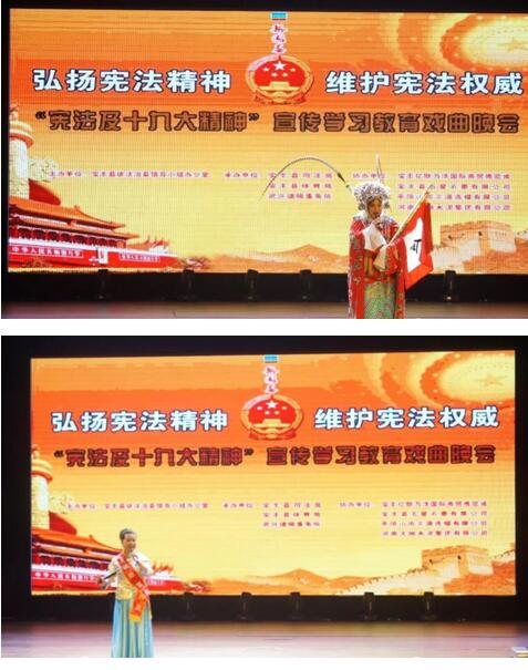 晚會(huì)在《梨園春》擂主演唱聲中拉開帷幕。通過法治小品《找調(diào)解》《遵紀(jì)守法好處多》,法治戲曲《法治順民心》《法官頌》等精彩節(jié)目,把法律知識(shí)和法治理念滲透其中,場(chǎng)內(nèi)掌聲陣陣。晚會(huì)還增設(shè)了法律知識(shí)有獎(jiǎng)問答活動(dòng),通過主持人提問、觀眾搶答的方式,圍繞“黨章”“兩學(xué)一做”“法律八進(jìn)”等知識(shí)內(nèi)容邀請(qǐng)觀眾參與互動(dòng),并向參與者發(fā)放法治小禮品,引導(dǎo)大家學(xué)法、守法、關(guān)心國(guó)家大事。