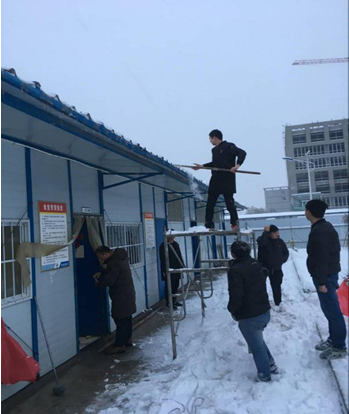 大伙兒冒著寒風(fēng),紛紛拿著鐵鍬、掃帚等打掃工具趕赴掃雪現(xiàn)場(chǎng),相互配合、齊心協(xié)力,你鏟我掃,一點(diǎn)點(diǎn)地將積雪鏟起集中堆放,一派熱火朝天的景象。經(jīng)過(guò)一個(gè)多小時(shí)的奮戰(zhàn),項(xiàng)目部施工現(xiàn)場(chǎng)主要通道和項(xiàng)目部院子、生活區(qū)等地的積雪全部鏟除,看著清理干凈的路面,大家洋溢著開(kāi)心的笑容。