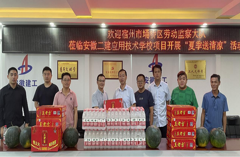 烈日炎炎,酷暑難當,為確保一線工人身心健康,督促做好夏季高溫期間安全生產工作,7月15日上午,宿州埇橋區(qū)勞動監(jiān)察大隊黨支部書記、副大隊長王建一行赴安徽二建宿州應用技術學校項目開展“夏季送清涼”活動,為奮戰(zhàn)在高溫下的建筑工人送來了真摯的問候和關懷。